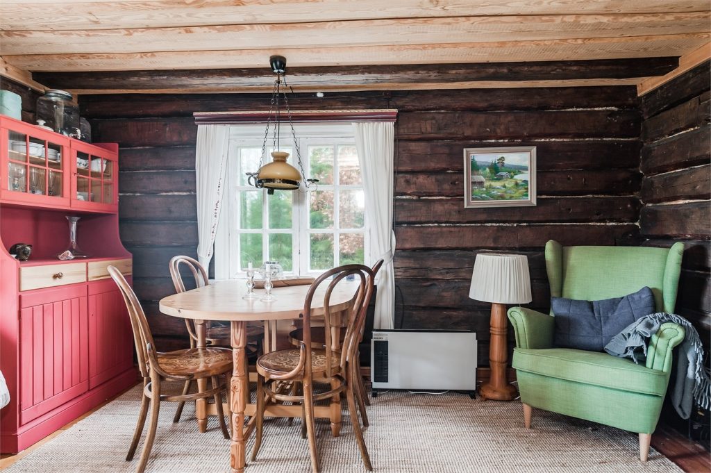 Von der Küche kommt man direkt in das Esszimmer. Hier steht neben zwei Schränken und einem für 4 Personen gut passendem Esstisch (ausklappbar) auch ein alter gemütlicher Lesesessel, in dem es sich gemütlich chillen lässt.