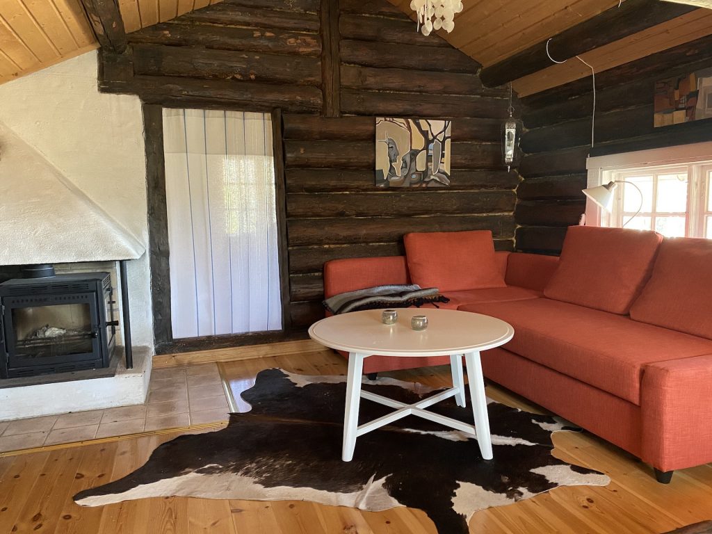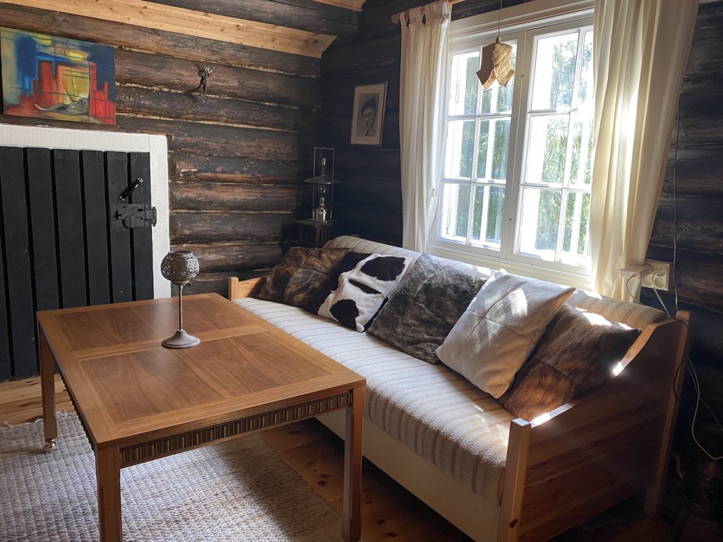 Das Wohnzimmer erstreckt sich über den Großteil des Obergeschosses und bietet verschiedene Sitzgelegenheiten (Schlafsofas), einen Kamin, eine schöne Stimmung, besonders am Abend und einen tollen Blick auf den Lakenesjön.