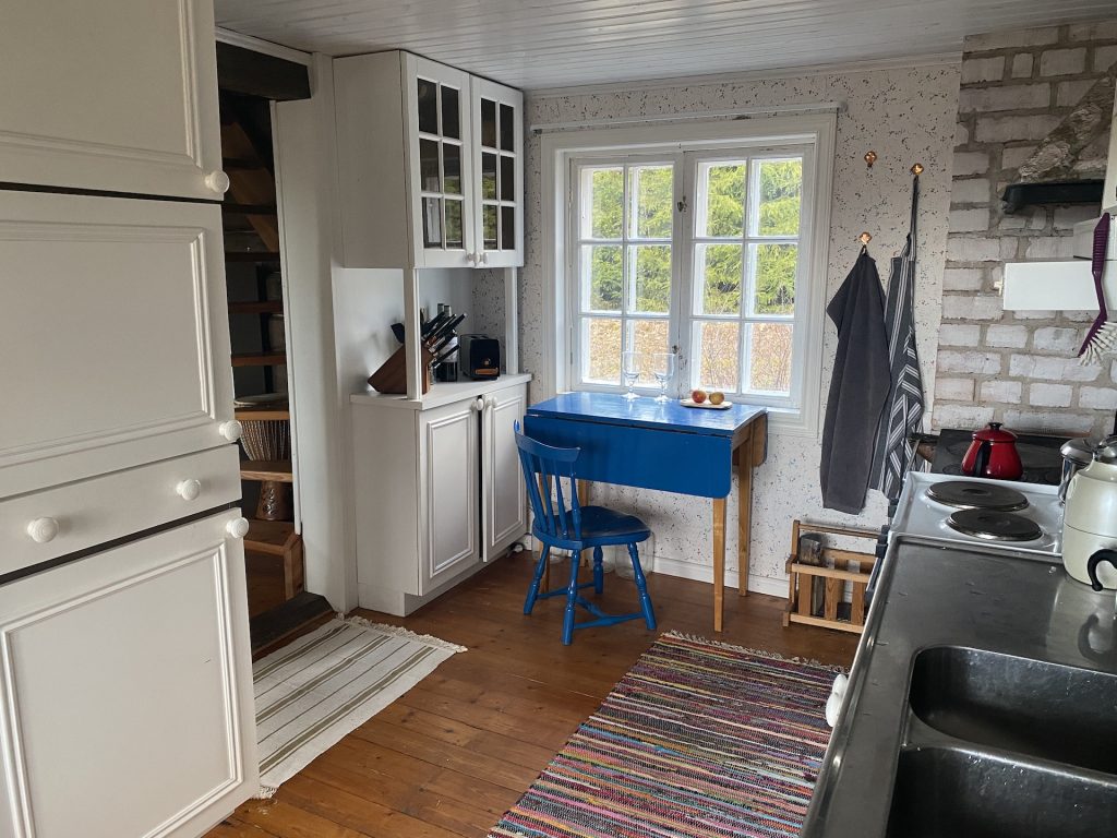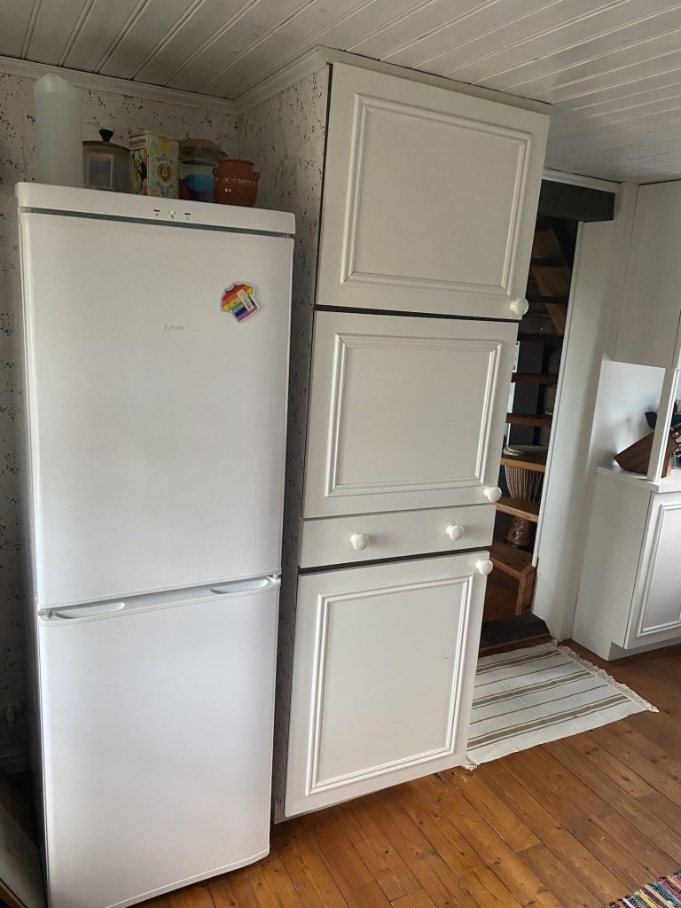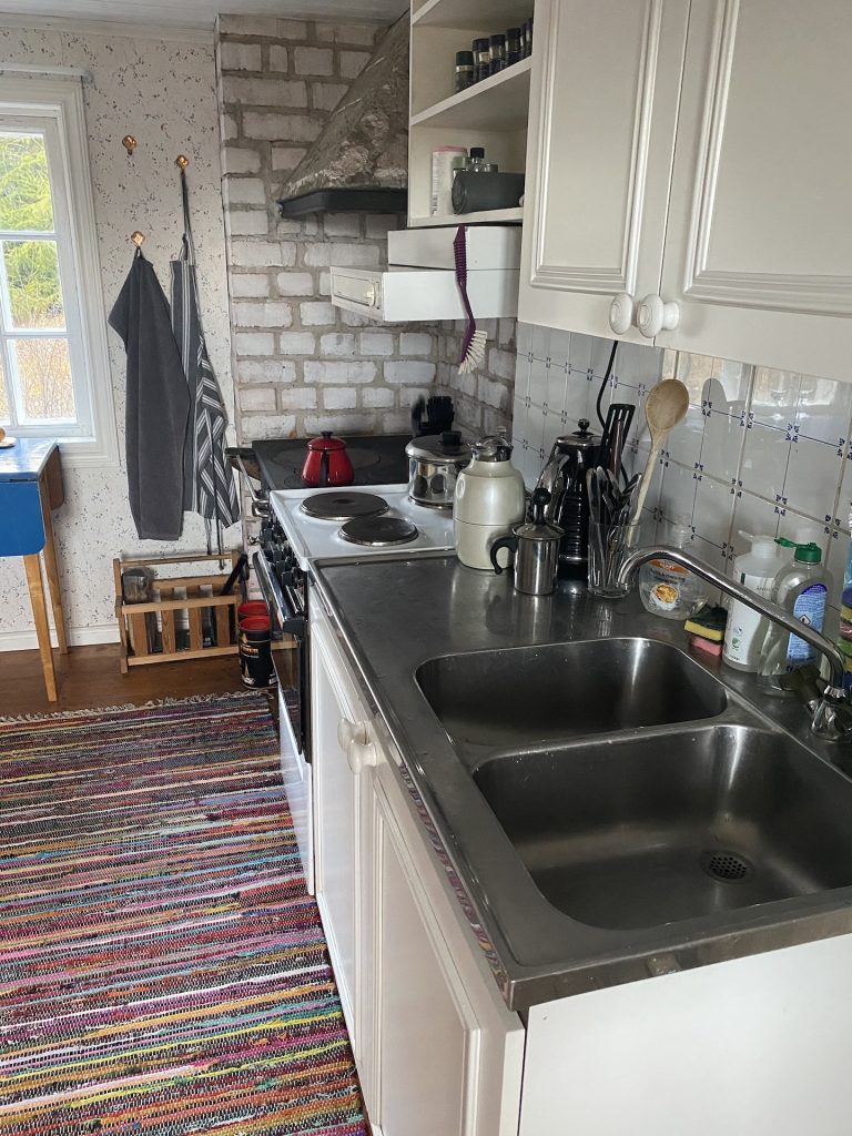 Ausgestattet ist alles mit einem gewachsenen Sammelsurium an Utensilien – Töpfe, Pfannen, Toaster, Wasserkocher, Kaffeemühle, Geschirr und Besteck, Gläser, Dosen, Schüsseln, Gewürze, Kaffeetüten, …